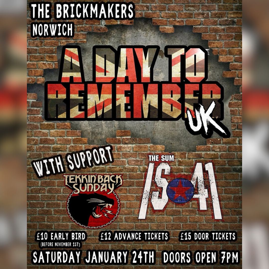 We are bringing some heavy hitters along with us for A Night To Remember! Join us, The Sum Is 41 – UK Sum 41 Tribute and Tekkin Back Sunday at the The Brickmakers and B2 Norwich for a pop punk party!