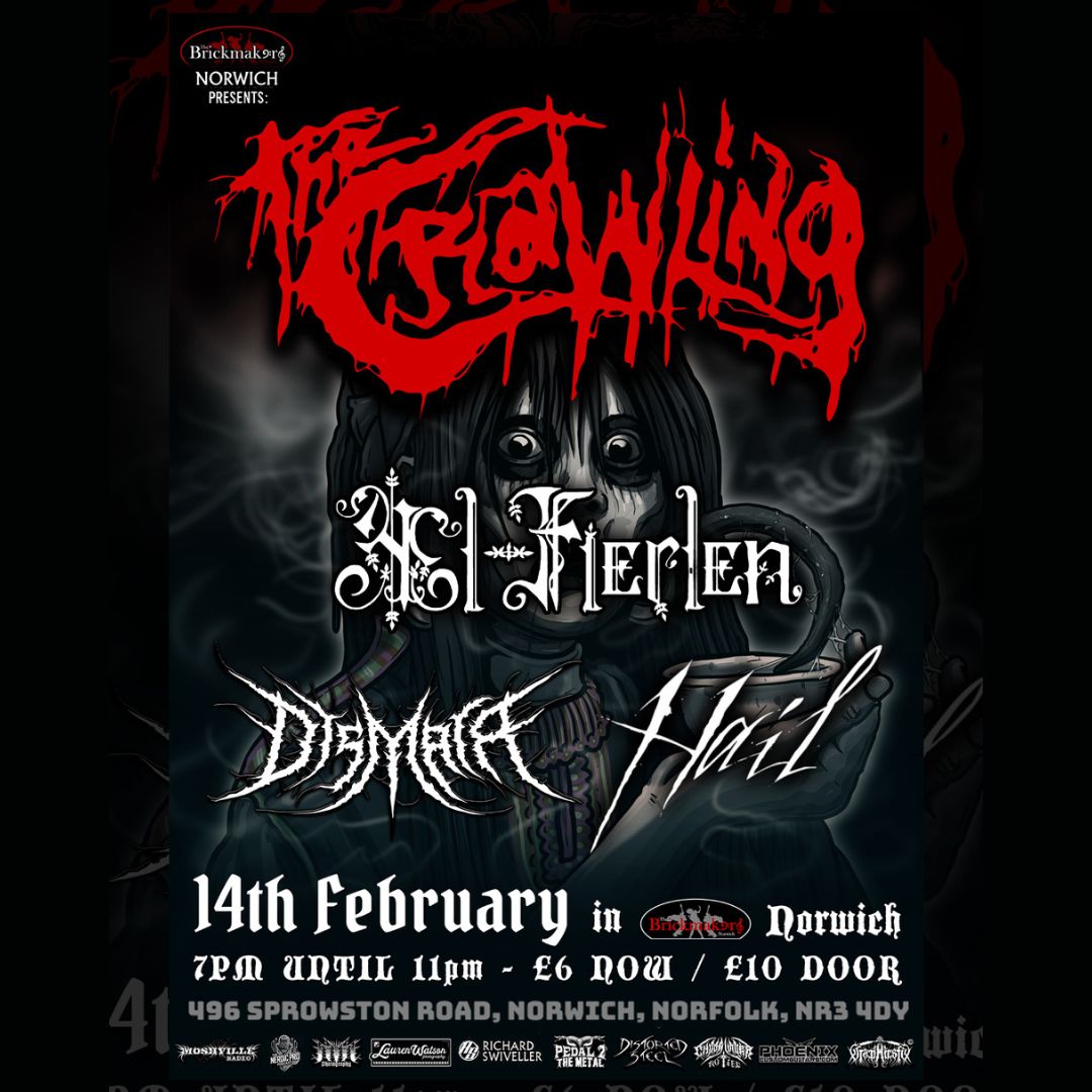 Doom/Death metal from Northern Ireland “The Crawling” debut in East Anglia after conqouring the rest of the UK. Support from Ael Fierlen, Hail and Dismara. This is a 100 capacity show so please grab a presales ticket early to ensure entry.