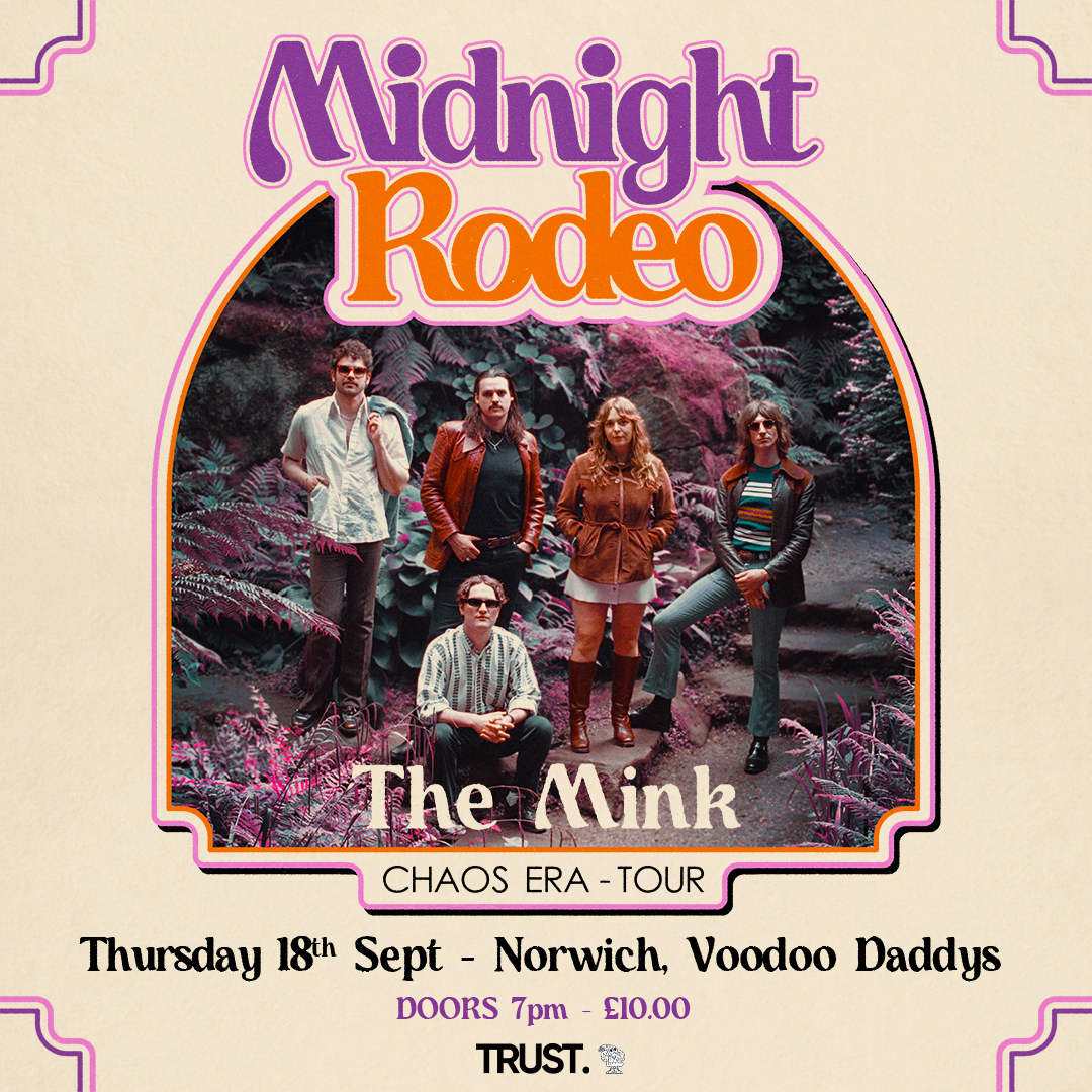 Midnight Rodeo formed out of the oscillating melting pot that is Nottingham, 6 friends who had plied their wares in various other projects were eventually bound together in the prodigiously convenient summer of 2021. Assembled by Maddy Chamberlain with the sole objective of banishing previous sonic shackles, such as compromising to ideals & hunting for vague ideas of success. Their tenacity is birthed from a fierce will to ensure their primary concept is a celebration of joy and a collective appreciation for the wonderfully weird.