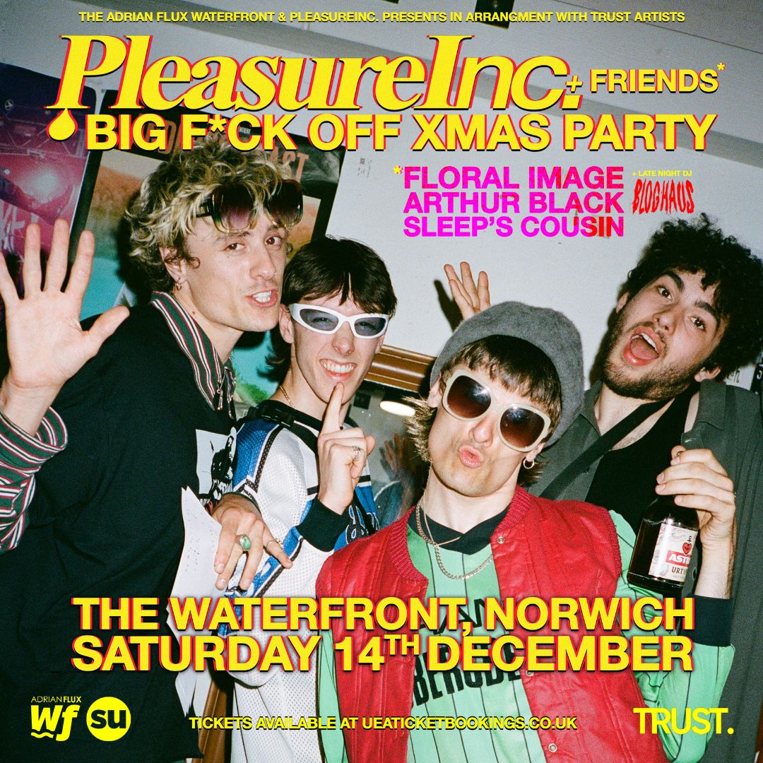PleasureInc. Founded in 2021 by Norwich-based brothers Jonny Silver (guitar/vox) and Kenny Pleasures (drums/vox), PleasureInc. take the blueprint of the ‘indie rock band’ and subvert expectations. Armed with the Babyface Killa (keys/percussion) and Burger (bass), their ‘genre fluid’ approach incorporates hip hop, indie, dance, fashion, 90s wrestling and comedy in their music and visuals, prioritising vibes, crease and character over genre norms.